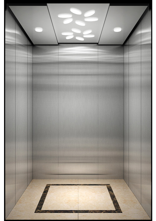 轎廂型號(hào):YG-1623  天井:香檳砂紋板(YG-07)  兩側(cè)、后側(cè)板:兩側(cè)灰色砂紋噴涂鋼板(YG-01)+鏡面不銹鋼,后側(cè)麥點(diǎn)布紋彩紋鋼板(HK-03)+鏡面飾條  前側(cè)板、門楣:緞紋不銹鋼  轎門:緞紋不銹鋼  地板:FL-P32  操作盤:BD-D2F1